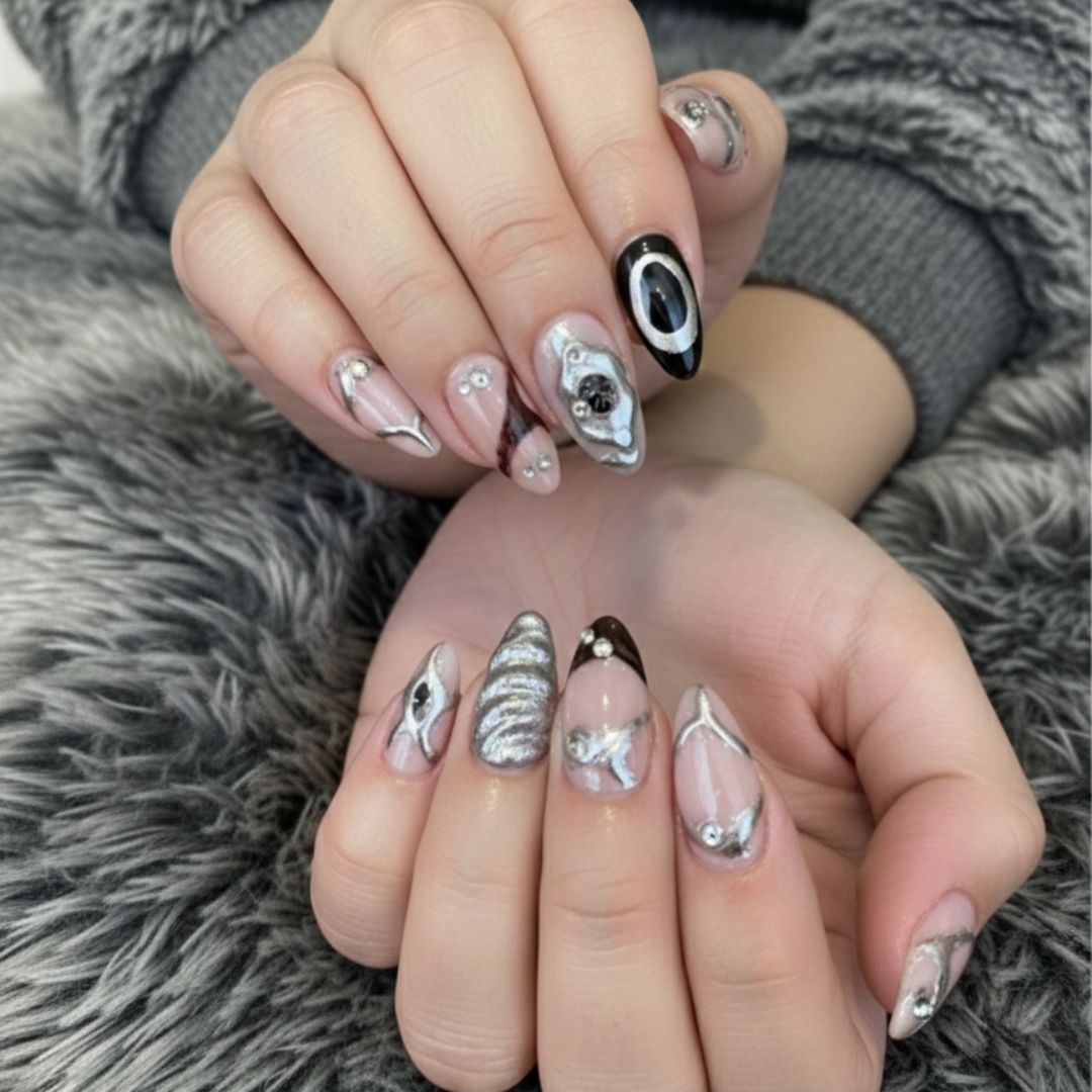 Strike like lightning and rule like a boss. The "Bijli Bolt Baddie" set is for the woman who brings the storm with her. This collection blends high-voltage silver liquid chrome with a deep, "Savage" black base for a look that is pure electric energy.