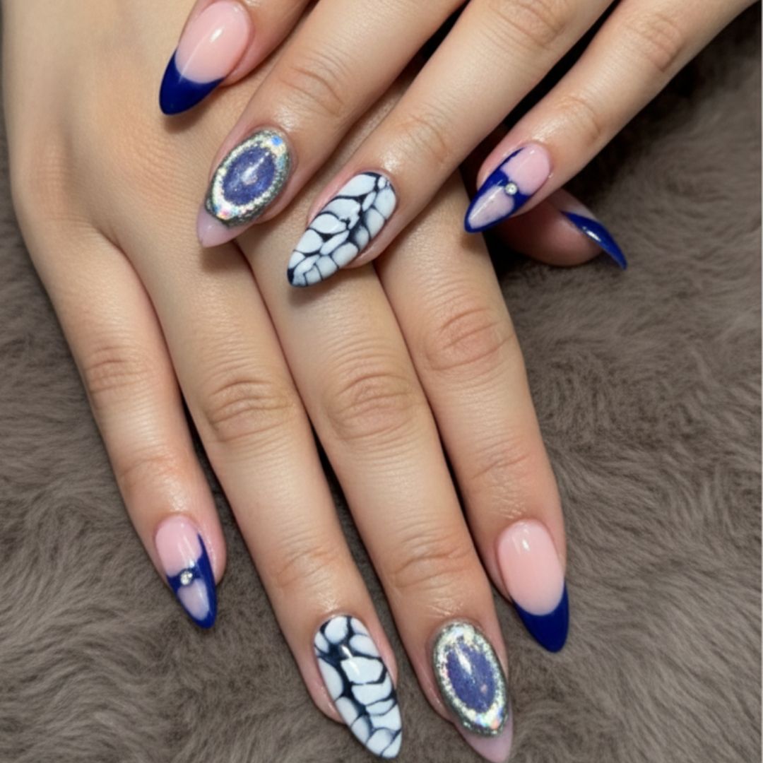 Dive deep into the blue with our "Neela Nasha" Press-On Nails. This set is designed for those who want their hands to look like a literal work of art. Featuring a "clean girl" milky base, deep cobalt blue swirls, these nails are pure Aankhon Ka Nasha (a treat for the eyes).
