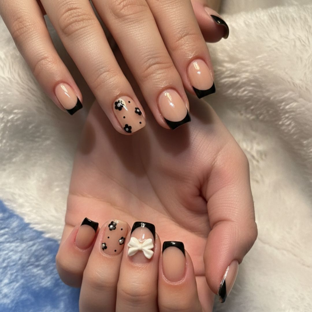 * Design: A sophisticated blend of edgy black tips and soft coquette aesthetics.